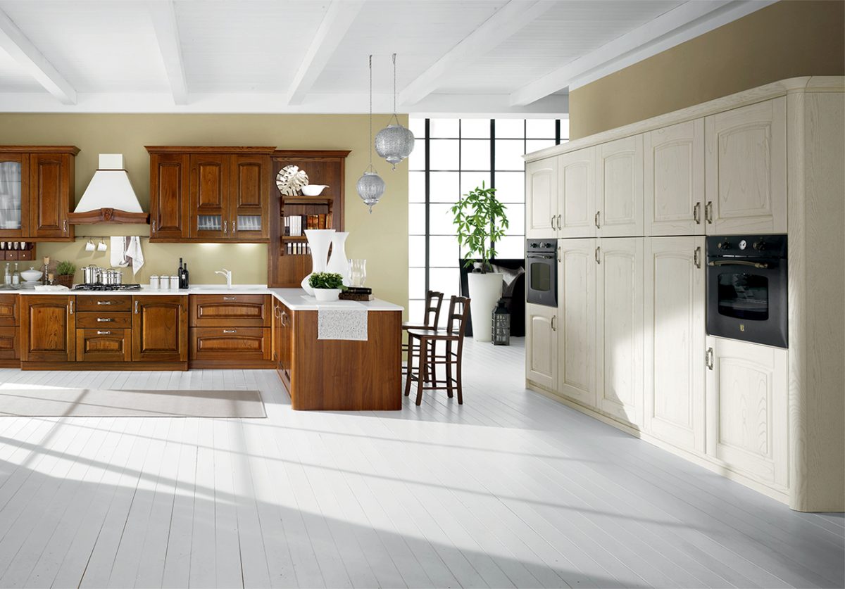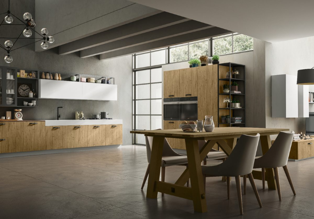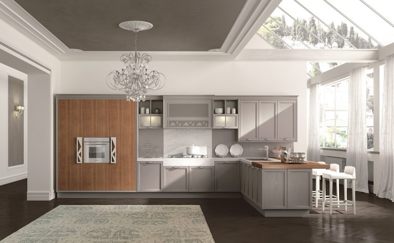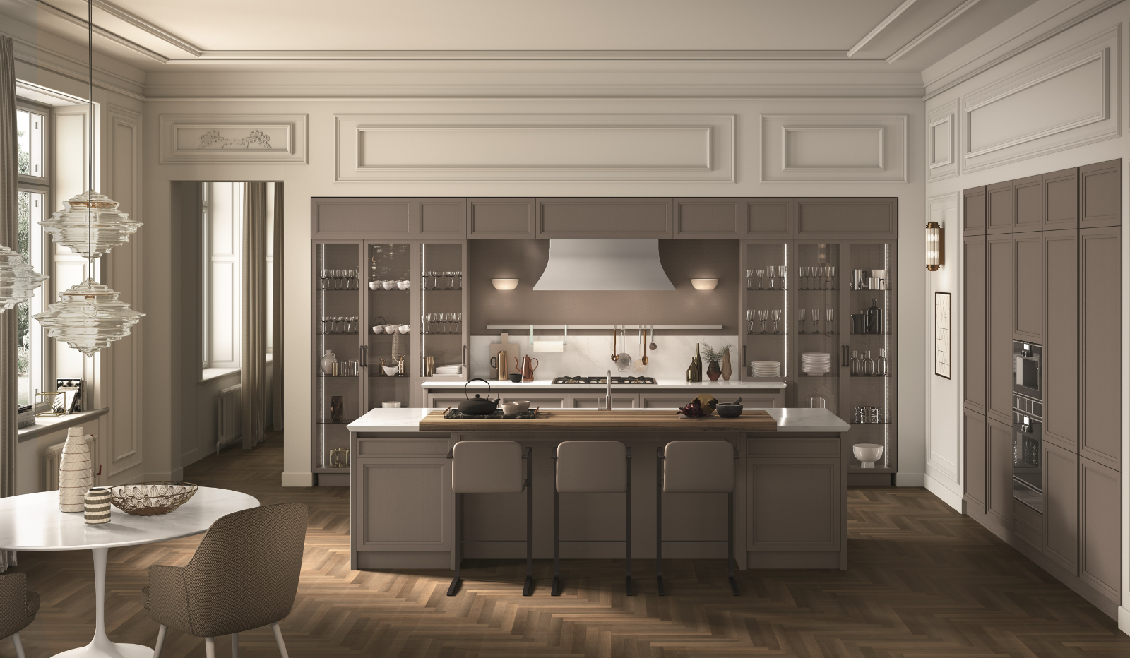 Una soluzione contemporanea elegante. Un progetto cucina che sa coniugare tradizione e innovazione, arricchito da idee come le armadiature, eleganti e funzionali, il cui design riprende la tradizione delle madie. Un mix unico, che porta il classico oltre il presente.